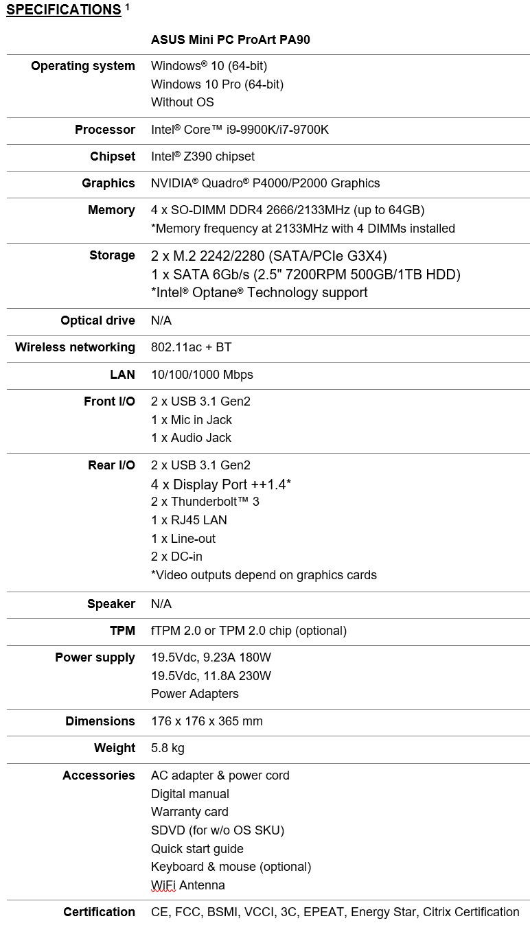 Το PA90 έχει διαστάσεις 176 x 176 x 365 χιλιοστά, βάρος 5,8 κιλά και εμφανισιακά θυμίζει πύργο. Στα τεχνικά χαρακτηριστικά του, που θα βρείτε πιο κάτω, περιλαμβάνονται μεταξύ άλλων, επεξεργαστής Intel Core i9-9900K ή i7-9700K, κάρτα γραφικών Nvidia Quadro P4000 ή P2000, μνήμη έως 64GB, μία θέση τύπου M.2 2242 ή 2280 (SATA/PCIe G3X4) και μία για αποθηκευτικό μέσο 2,5'', καθώς και υποστήριξη για Intel Optane. Στις υποδοχές περιλαμβάνονται δύο USB 3.1 (Gen 2) αλλά και δύο Thunderbolt 3.