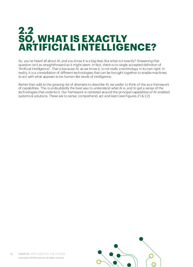 - 11. 12 GREECE: WITH AN AI TO THE FUTURE Copyright © 2019 Accenture. All rights reserved. 2.2 SO, WHAT IS EXACTLY ARTIFICIAL INTELLIGENCE? So, you’ve heard all about AI, and you know it is a big deal. But what is it exactly? Answering that question isn’t as straightforward as it might seem. In fact, there is no single accepted definition of “Artificial Intelligence”. That is because AI, as we know it, is not really a technology in its own right. In reality, it is a constellation of different technologies that can be brought together to enable machines to act with what appears to be human-like levels of intelligence. Rather than add to the growing list of attempts to describe AI, we prefer to think of this as a framework of capabilities. This is undoubtedly the best way to understand what AI is, and to get a sense of the technologies that underlie it. Our framework is centered around the principal capabilities of AI-enabled systems & solutions. These are to sense, comprehend, act and learn (see Figures 2.1 & 2.2).