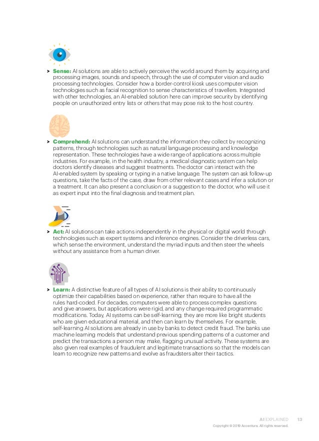 - 12. AI EXPLAINED 13 Copyright © 2019 Accenture. All rights reserved. >> Sense: AI solutions are able to actively perceive the world around them by acquiring and processing images, sounds and speech, through the use of computer vision and audio processing technologies. Consider how a border-control kiosk uses computer vision technologies such as facial recognition to sense characteristics of travellers. Integrated with other technologies, an AI-enabled solution here can improve security by identifying people on unauthorized entry lists or others that may pose risk to the host country. >> Comprehend: AI solutions can understand the information they collect by recognizing patterns, through technologies such as natural language processing and knowledge representation. These technologies have a wide range of applications across multiple industries. For example, in the health industry, a medical diagnostic system can help doctors identify diseases and suggest treatments. The doctor can interact with the AI-enabled system by speaking or typing in a native language. The system can ask follow-up questions, take the facts of the case, draw from other relevant cases and infer a solution or a treatment. It can also present a conclusion or a suggestion to the doctor, who will use it as expert input into the final diagnosis and treatment plan. >> Act: AI solutions can take actions independently in the physical or digital world through technologies such as expert systems and inference engines. Consider the driverless cars, which sense the environment, understand the myriad inputs and then steer the wheels without any assistance from a human driver. >> Learn: A distinctive feature of all types of AI solutions is their ability to continuously optimize their capabilities based on experience, rather than require to have all the rules hard-coded. For decades, computers were able to process complex questions and give answers, but applications were rigid, and any change required programmatic modifications. Today, AI systems can be self-learning; they are more like bright students who are given educational material, and then can learn by themselves. For example, self-learning AI solutions are already in use by banks to detect credit fraud. The banks use machine learning models that understand previous spending patterns of a customer and predict the transactions a person may make, flagging unusual activity. These systems are also given real examples of fraudulent and legitimate transactions so that the models can learn to recognize new patterns and evolve as fraudsters alter their tactics.