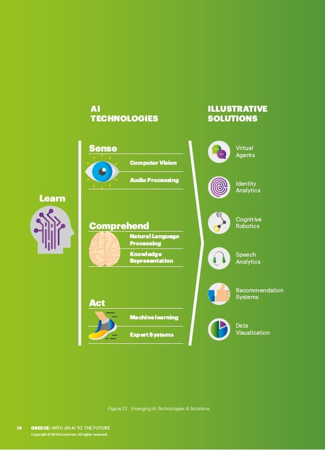 - 13. 14 GREECE: WITH AN AI TO THE FUTURE Copyright © 2019 Accenture. All rights reserved. Figure 2.1. Emerging AI Technologies & Solutions AI TECHNOLOGIES ILLUSTRATIVE SOLUTIONS Identity Analytics Speech Analytics Recommendation Systems Virtual Agents Data Visualization Cognitive Robotics Sense Computer Vision Audio Processing Learn Comprehend Natural Language Processing Knowledge Representation Act Machine learning Expert Systems 14 GREECE: WITH AN AI TO THE FUTURE Copyright © 2019 Accenture. All rights reserved.