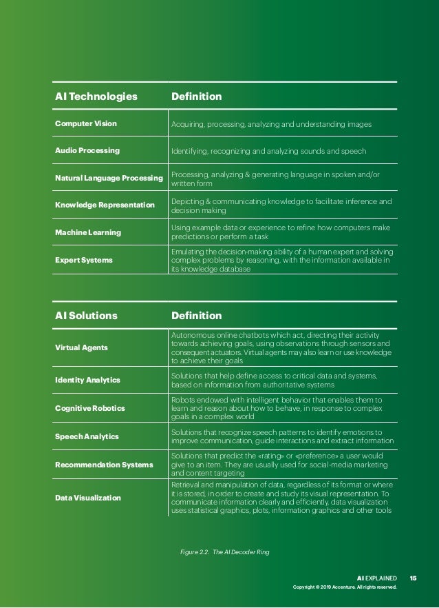 - 14. AI EXPLAINED 15 Copyright © 2019 Accenture. All rights reserved. AI Technologies Definition Computer Vision Acquiring, processing, analyzing and understanding images Audio Processing Identifying, recognizing and analyzing sounds and speech Natural Language Processing Processing, analyzing & generating language in spoken and/or written form Knowledge Representation Depicting & communicating knowledge to facilitate inference and decision making Machine Learning Using example data or experience to refine how computers make predictions or perform a task Expert Systems Emulating the decision-making ability of a human expert and solving complex problems by reasoning, with the information available in its knowledge database AI Solutions Definition Virtual Agents Autonomous online chatbots which act, directing their activity towards achieving goals, using observations through sensors and consequent actuators. Virtual agents may also learn or use knowledge to achieve their goals Identity Analytics Solutions that help define access to critical data and systems, based on information from authoritative systems Cognitive Robotics Robots endowed with intelligent behavior that enables them to learn and reason about how to behave, in response to complex goals in a complex world Speech Analytics Solutions that recognize speech patterns to identify emotions to improve communication, guide interactions and extract information Recommendation Systems Solutions that predict the «rating» or «preference» a user would give to an item. They are usually used for social-media marketing and content targeting Data Visualization Retrieval and manipulation of data, regardless of its format or where it is stored, in order to create and study its visual representation. To communicate information clearly and efficiently, data visualization uses statistical graphics, plots, information graphics and other tools Figure 2.2. The AI Decoder Ring AI EXPLAINED 15 Copyright © 2019 Accenture. All rights reserved.