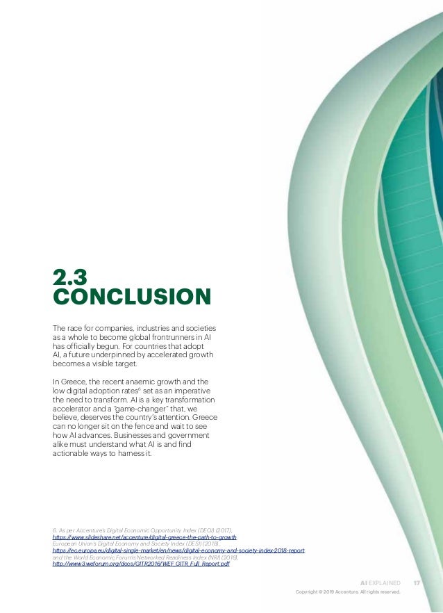 - 16. AI EXPLAINED 17 Copyright © 2019 Accenture. All rights reserved. The race for companies, industries and societies as a whole to become global frontrunners in AI has officially begun. For countries that adopt AI, a future underpinned by accelerated growth becomes a visible target. In Greece, the recent anaemic growth and the low digital adoption rates6 set as an imperative the need to transform. AI is a key transformation accelerator and a “game-changer” that, we believe, deserves the country’s attention. Greece can no longer sit on the fence and wait to see how AI advances. Businesses and government alike must understand what AI is and find actionable ways to harness it. 2.3 CONCLUSION 6. As per Accenture's Digital Economic Opportunity Index (DEOI) (2017), https://www.slideshare.net/accenture/digital-greece-the-path-to-growth, European Union's Digital Economy and Society Index (DESI) (2018), https://ec.europa.eu/digital-single-market/en/news/digital-economy-and-society-index-2018-report, and the World Economic Forum's Networked Readiness Index (NRI) (2016), http://www3.weforum.org/docs/GITR2016/WEF_GITR_Full_Report.pdf