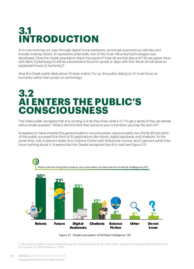 - 19. 20 GREECE: WITH AN AI TO THE FUTURE Copyright © 2019 Accenture. All rights reserved. FutureRobots Digital Assistants Do not know Chatbots Science Fiction 30% Other 27% 23% 4% 12% 2% 2% What is the first thing that comes to your mind when you hear the term Artificial Intelligence (AI)? AI is now entering our lives through digital home assistants, prototype autonomous vehicles and friendly-looking robots. AI represents potentially one of the most influential technologies ever developed. Does the Greek population share this opinion? How do we feel about AI? Do we agree more with Mark Zuckerberg (AI will be a benevolent force for good) or align with Elon Musk (AI will pose an existential threat to humanity)? How the Greek public feels about AI does matter. For us, the public dialog on AI must focus on humanity rather than purely on technology. 3.1 INTRODUCTION The Greek public recognize that AI is coming, but do they know what it is7 ? To get a sense of this, we started with a simple question: “What is the first think that comes to your mind when you hear the term AI?” AI appears to have entered the general public’s consciousness. Approximately two thirds (65 percent) of the public surveyed first think of AI applications like robots, digital assistants and chatbots. At the same time, only 4 percent relate AI to Science Fiction and Hollywood movies, and 2 percent admit they know nothing about it. It seems that the Greeks recognize that AI is real (see Figure 3.1). 3.2 AI ENTERS THE PUBLIC’S CONSCIOUSNESS Figure 3.1. Greeks’ perception of Artificial Intelligence, (%) 7. The analysis is based on data recorded through the AI Questionnaire for the Greek Public, executed by Focus Bari Market Research SA from January 16, 2019 to February 1, 2019.