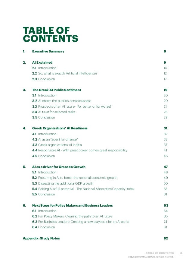 - 2. Copyright © 2019 Accenture. All rights reserved. 3TABLE OF CONTENTS TABLE OF CONTENTS 1. Executive Summary 6 2. AI Explained 9 2.1 Introduction 10 2.2 So, what is exactly Artificial Intelligence? 12 2.3 Conclusion 17 3. The Greek AI Public Sentiment 19 3.1 Introduction 20 3.2 AI enters the public’s consciousness 20 3.3 Prospects of an AI future - For better or for worse? 21 3.4 AI trust for selected tasks 26 3.5 Conclusion 29 4. Greek Organizations’ AI Readiness 31 4.1 Introduction 32 4.2 AI as an ″agent for change″ 33 4.3 Greek organizations’ AI inertia 37 4.4 Responsible AI - With great power comes great responsibility 41 4.5 Conclusion 45 5. AI as a driver for Greece’s Growth 47 5.1 Introduction 48 5.2 Factoring in AI to boost the national economic growth 49 5.3 Dissecting the additional GDP growth 50 5.4 Seizing AI’s full potential - The National Absorptive Capacity Index 55 5.5 Conclusion 61 6. Next Steps for Policy Makers and Business Leaders 63 6.1 Introduction 64 6.2 For Policy Makers: Clearing the path to an AI future 65 6.3 For Business Leaders: Creating a new playbook for an AI world 74 6.4 Conclusion 81 Appendix: Study Notes 82