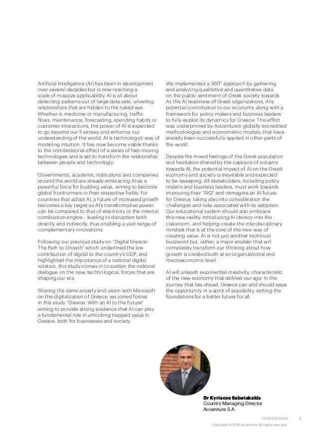 - 3. Copyright © 2019 Accenture. All rights reserved. 4 GREECE: WITH AN AI TO THE FUTURE Artificial Intelligence (AI) transforms our societies, the way we perceive the world, essentially altering our way of living. Today, we are already beyond the “science fiction” discussion. AI is broadly used in everyday applications. From navigating our cars to automatic translation, from intelligent chatbots to shopping recommendations. Smart homes, smart cars, smart cities. AI is everywhere, it is becoming embedded in our reality. Even though AI isn’t new - computer scientists at Microsoft and elsewhere have been working on AI technologies for the past three decades - it is only in the last few years that AI has moved into mainstream products thanks to a confluence of three factors: the massive computing power of the cloud, the availability of enormous datasets that can be used to teach AI systems and the breakthroughs in developing AI algorithms and improving AI methods such as deep learning. Taken together, these advantages are enabling scientists and developers all over the world to create products and services that use AI to better understand, anticipate and respond to people’s needs. At the same time, AI is changing the businesses that adopt it, having a significant economic and societal effect. It has become clear that the countries that will fare best in the new AI era will be those that embrace these changes rapidly and effectively. This is because new jobs and economic growth will come to those that embrace the technology, not those that resist or delay adopting it. At the same time, there will be challenges coming along with opportunities. We must address the need for strong ethical principles, the evolution of laws, training for new skills and even labor market reforms. This must all come together if we are going to make the most of AI. The potential is enormous. Our world is becoming more intelligent. But is Greece adopting AI? We, at Microsoft Hellas, stay true to our commitment: to bring to Greece, the latest global technology discussion, in real time. We strongly believe that technology can provide the key to unlock Greece’s potential and play a major role in our country’s economic growth and quality of life of its people. Although we recognize that the pace of change is not going to be the same from nation to nation and from region to region, we felt the urgency to observe these changes early and commit not only to foster innovation and progress but also to ensure that our country is not left behind. We also recognize our responsibility to build AI in a way that fosters trust. We acknowledge the need to work together with governments, businesses, academics, social services and NGOs, since AI cannot be created by the tech sector alone. We need to democratize AI in a manner that resembles the way we made the PC available to everyone, so that its benefits are equally distributed. This new study in collaboration with Accenture is aiming at shedding more light and demystifying the status, impact and potential of AI in Greek economy and society. While we don’t have a crystal ball that shows us the future, we do acknowledge that we are all going to need to spend more time listening to and learning from each other. The emerging discussion around AI and its impact is more relevant and urgent than ever. I aspire that this endeavor will contribute to a constructive dialogue and sparkle a set of actions on policy, education, research, business and technology which eventually will level Greece up for the future. A sustainable, optimistic, thriving future for all. Peggy Antonakou CEO Microsoft Greece, Cyprus & Malta FOREWORD