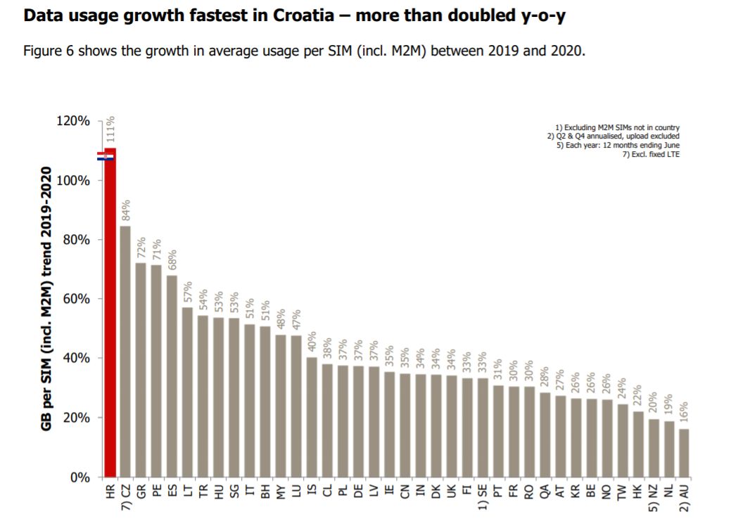 Για την ακρίβεια και σύμφωνα με ανάλυση της Tefficient’s για την εξέλιξη της χρήσης των mobile data παγκοσμίως το 2020, η Ελλάδα παρουσίασε τον τρίτο υψηλότερο ρυθμό ανάπτυξης μεταξύ των 44 χωρών που αναλύθηκαν, στην χρήση δεδομένων ακολουθώντας την Κροατία και την Τσεχία. Βάσει της έκθεσης, η χρήση mobile data στην περίπτωση της χώρας αυξήθηκε κατά 72% το 2020 εν συγκρίσει με το 2019. Αντίστοιχα οι κάρτες SIM της Κροατίας κατανάλωσαν 111% περισσότερα mobile data κατά μέσο όρο το 2020 σε σχέση με το 2019, ενώ στο 84% έφτασε η αύξηση της κατανάλωσης mobile data στην περίπτωση της Τσεχίας. Την πρώτη πεντάδα των χωρών με υψηλούς ρυθμούς ανάπτυξης συμπλήρωσαν την προηγούμενη χρονιά το Περού (71%) και η Ισπανία (68%).