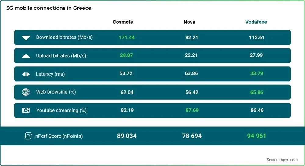 Αποτελέσματα 5G: Οι συνδρομητές της Cosmote mobile απολάμβαναν την υψηλότερη μέση ταχύτητα λήψης 5G (171 Mb/s).