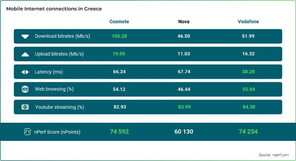 - Δοκιμή ταχύτητας: Στην ολοκληρωμένη ανάλυσή μας που εκτείνεται από την 1η Ιανουαρίου έως τις 31 Δεκεμβρίου 2023, η Cosmote (100 Mb/s) έχει αναγνωριστεί ότι παρέχει τις ταχύτερες ταχύτητες λήψης από κινητά στην Ελλάδα.